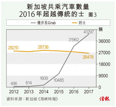 與紐約相似,新加坡明顯沒有如港府般咄咄逼人,讓當地共乘市場得以長足發展:除了本文提及的優步,還有在東南亞地區常見的Grab亦在當地大行其道。此兩股新力量對新加坡的士生態造成翻天覆地的改變,共乘汽車由2012年佔的士數量1.8%,暴漲至2015年中超過本地的士【圖3】,繼而於2017年增至比傳統的士多56%之多,再次顯示市場強大的的顛覆力量。