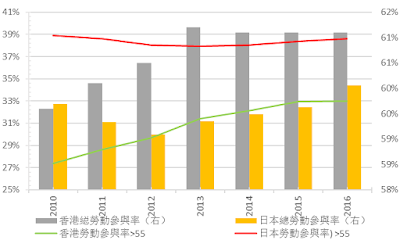 事實上,在東京及本港,老人的失業率似乎都比整體人口的失業率低【圖八】,兼且,香港長者的勞動參與率在不斷上升【圖九】:如果香港人口年齡分佈像東京一樣,則長者勞動參與率(已經從2010年之27%上升到2016年之33%)將進一步向39%邁進。