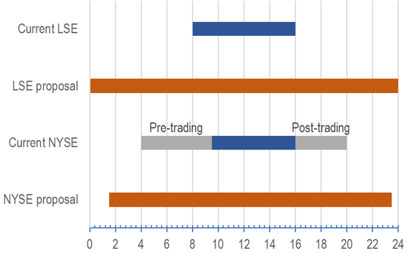 Not to be outdone by their peers across the pond, the London Stock Exchange (LSE) is now also reported (see here) to be studying how they could extend their offering – to an even more ambitious round-the-clock service (second bar above)!