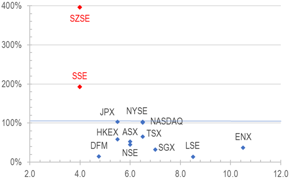 Chart 3: Vol / Mkt Cap vs Hours Traded (Excluding SSE & SZSE)![]() |