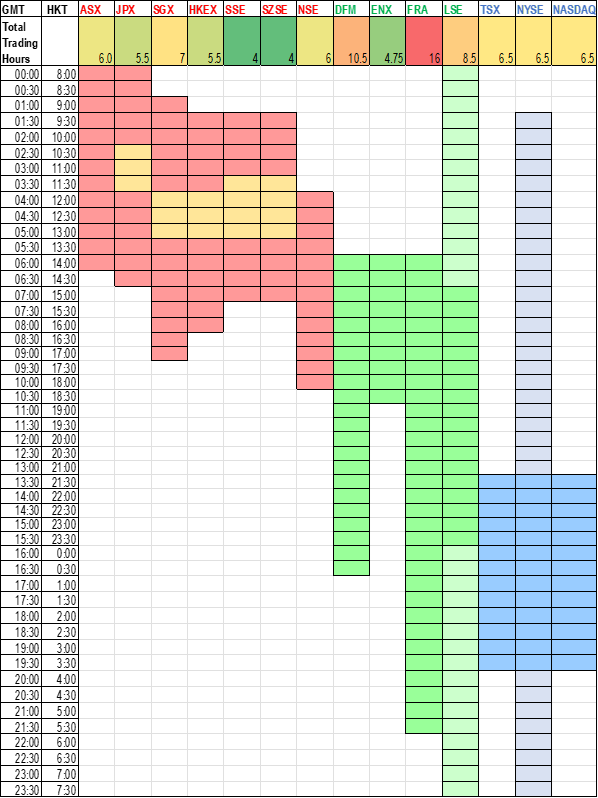 With stock investing going global in the age of easy data feeds and online trading platforms, the need to be able to access your target markets can only rise. Let us look at the current set up across major exchanges in each time zone: