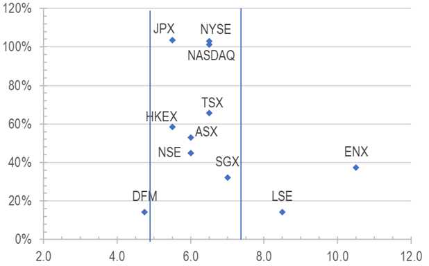 One big disappointment is that of LSE, which despite having longer trading hours, features badly in its trading efficiency. This suggests that there are other structural issues at play – could it be low valuations which put off potential listing candidates, or is it over-enthusiastic regulation making life difficult for existing candidates? After all, what this also points to is the fact that stock exchanges are in a global competitive race for members, and extending trading hours is but one of many factors that will make or break an exchange’s future prospects.