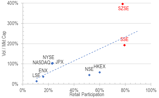 The chart above seems to prove our suspicion – with significantly higher retail stock investing (in the 80%s), the PRC exchanges corroborate the trend line of higher retail = higher volume/market cap.