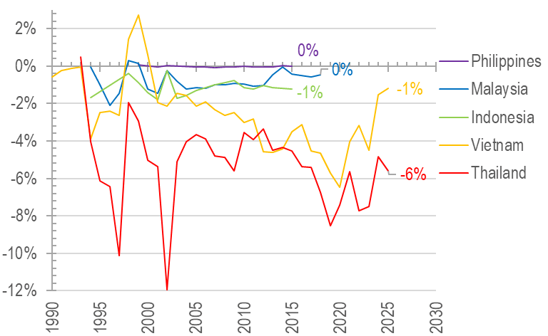 What is more, Thailand has a massive trade surplus with Cambodia, worth 6% of Cambodia’s GDP (red line above), meaning the need to reconcile is much stronger for Thailand than for Cambodia; however, a meaningful amount of this trade may be input components for Cambodia’s further export processing.