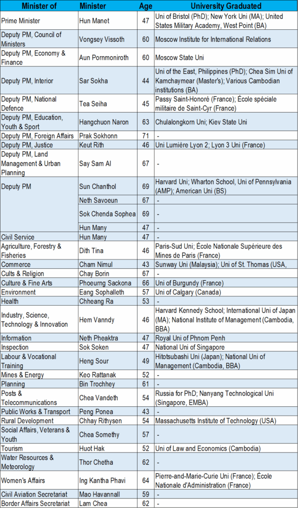 Most people may associate Cambodia with patriarchal sedantry, but a look beneath the hood reveals that the country is ruled by highly educated, young technocrats – below is the full list of cabinet ministers with their age and education: