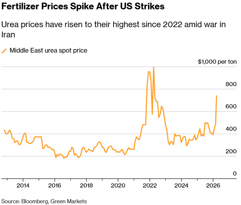 Article 6: A North Carolina farmer warns that the Persian Gulf fertilizer crisis, with urea prices surging from $475 to $550/ton due to war disruptions, will trigger a massive decline in U.S. crop yields and planted acres …potentially driving global food prices up 12–18% by 2026.