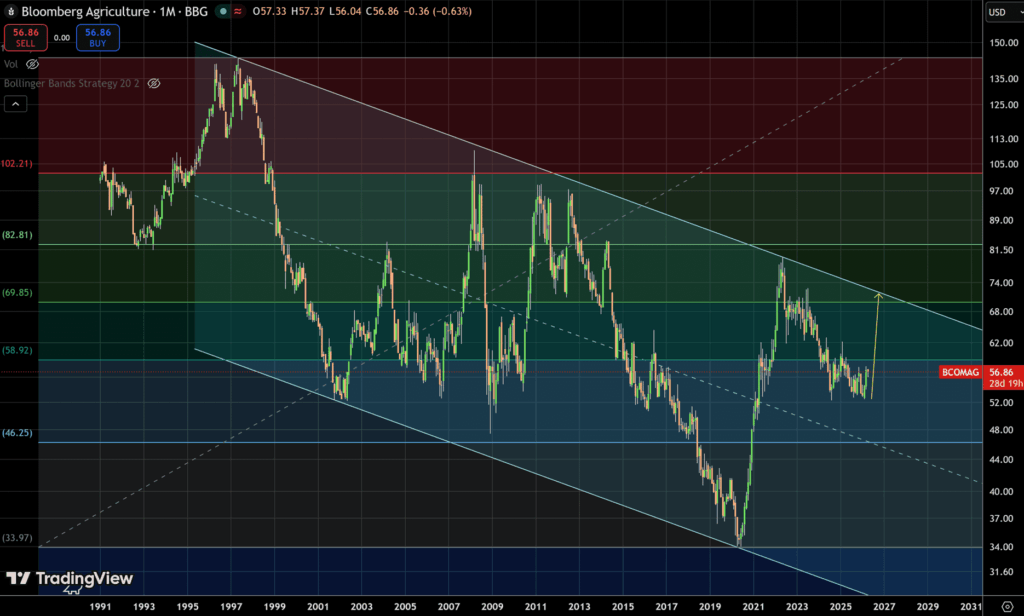 Agri price index has already broken out of the down trend from the 2022 highs above, and could well recapture the 2011 highs in the next few months.